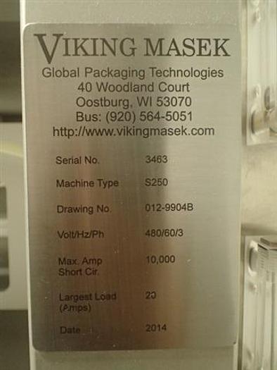 Used Viking Masek vertical powder form fill and seal unit, model S250, speeds up to 140/minute, 250 mm long x 400 mm wide maximum bag size, 50 mm long x 60 mm wide minimum bag size, servo driven sealing drive, 550 mm maximum roll diameter, 454 mm maximum roll width, with powder filling head with (2) filling screws, bag forming head, Hapman flexible auger feeder, Markem-Imaje Smartdate X40 coder, Siemens HMI with Siemens PLC and servo motor drive, 460 volt, serial #3463, built 2014. Viking Masek Model S250 Vertical Form/Fill/Seal Machine w/ Markem Printer