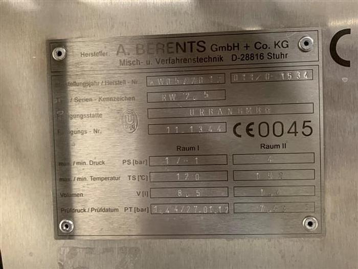 used A Berents BECOMIX homogenizer, model RW 2.5, stainless steel construction, .5 - 3.5 liter capacity, rated -1/+1 bar at 120 c internal, jacketed for 4 bar at 150 c, top mounted mixer with side wall scrapper, bottom mounted homogenizer colloid mill motor, Siemens plc control with motor variable speed controllers, order# 011/0-1534, serial# 11.1344, built 2012. Becomix 2.5 liter Mixer