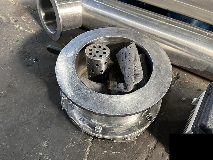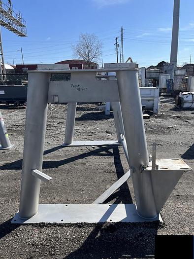 Used Patterson Kelley 50 cu ft Stainless Steel twin shell blender with attached drum lift/blender charger. Rated for 95 lbs per cu ft. 10" Valve. Approximately 67" leg extensions. Approximately 84" discharge height. SN# C486125.